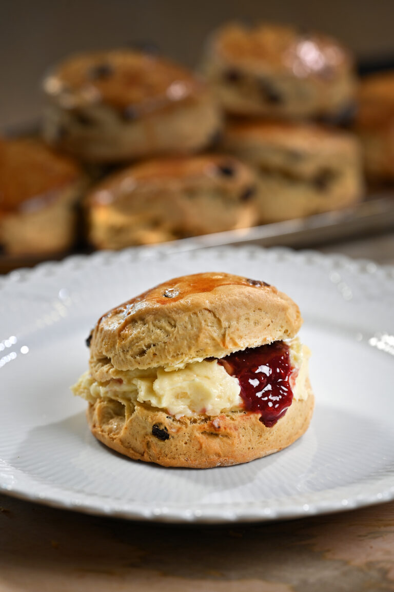 Englische Scones sind ein klassisches Gebäck zur Teatime – außen zart gebräunt, innen fluffig und weich. Traditionell werden sie noch warm mit Clotted Cream und Erdbeermarmelade serviert – ein echter Genuss zum Nachmittagstee.