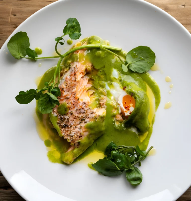 Ein köstliches Gericht welches die Aromen der Forelle perfekt mit der pürrierten Brunnenkresse und dem pochiertem Ei verbindet.