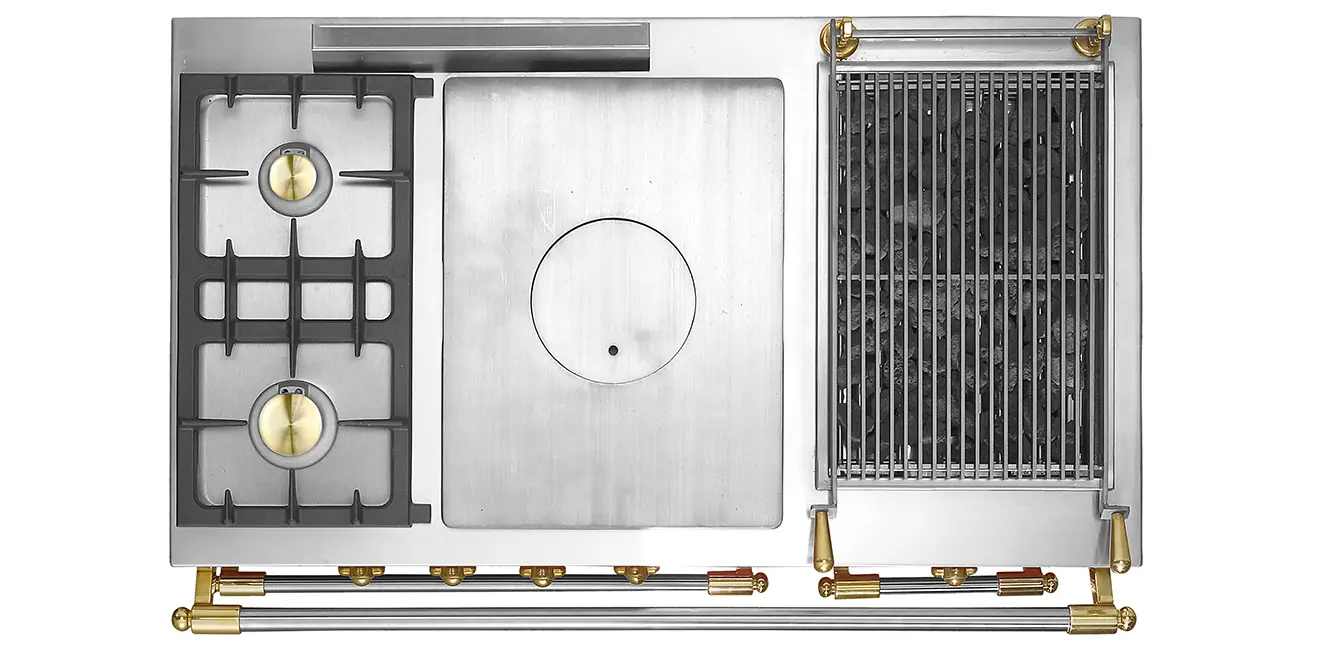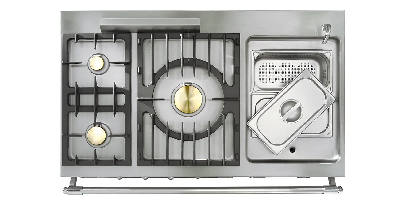 Professioneller 3 oder 4-flammiger Gas- oder Elektrokochstelle mit zusätzlicher Kochstelle links: wie Grill, Plancha, Teppan Yaki, Bain Marie, Wokbrenner, Friteuse u.v.m.