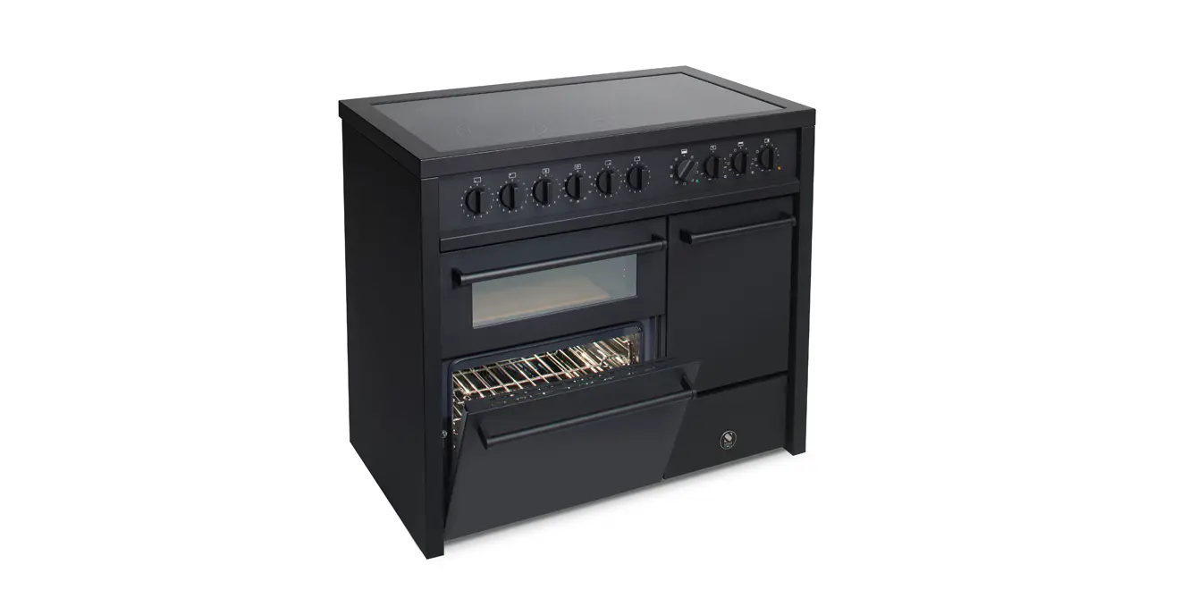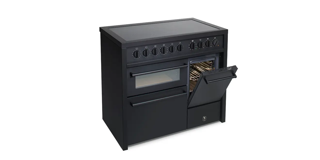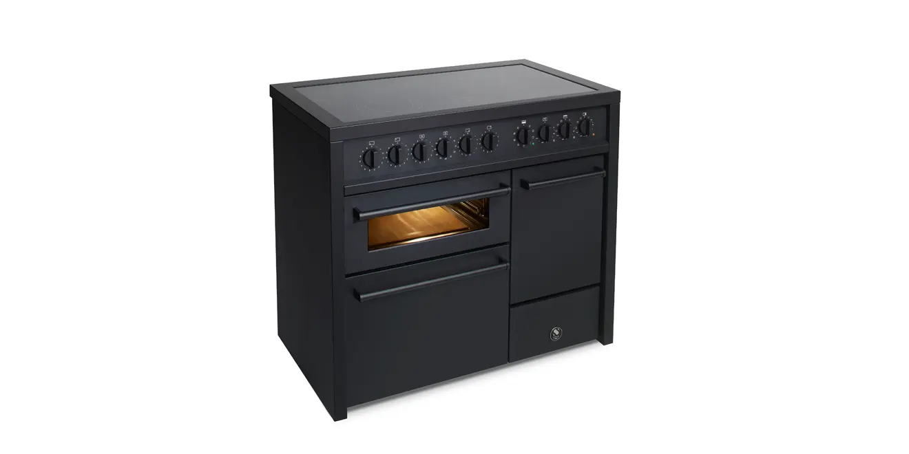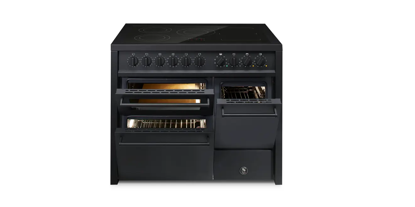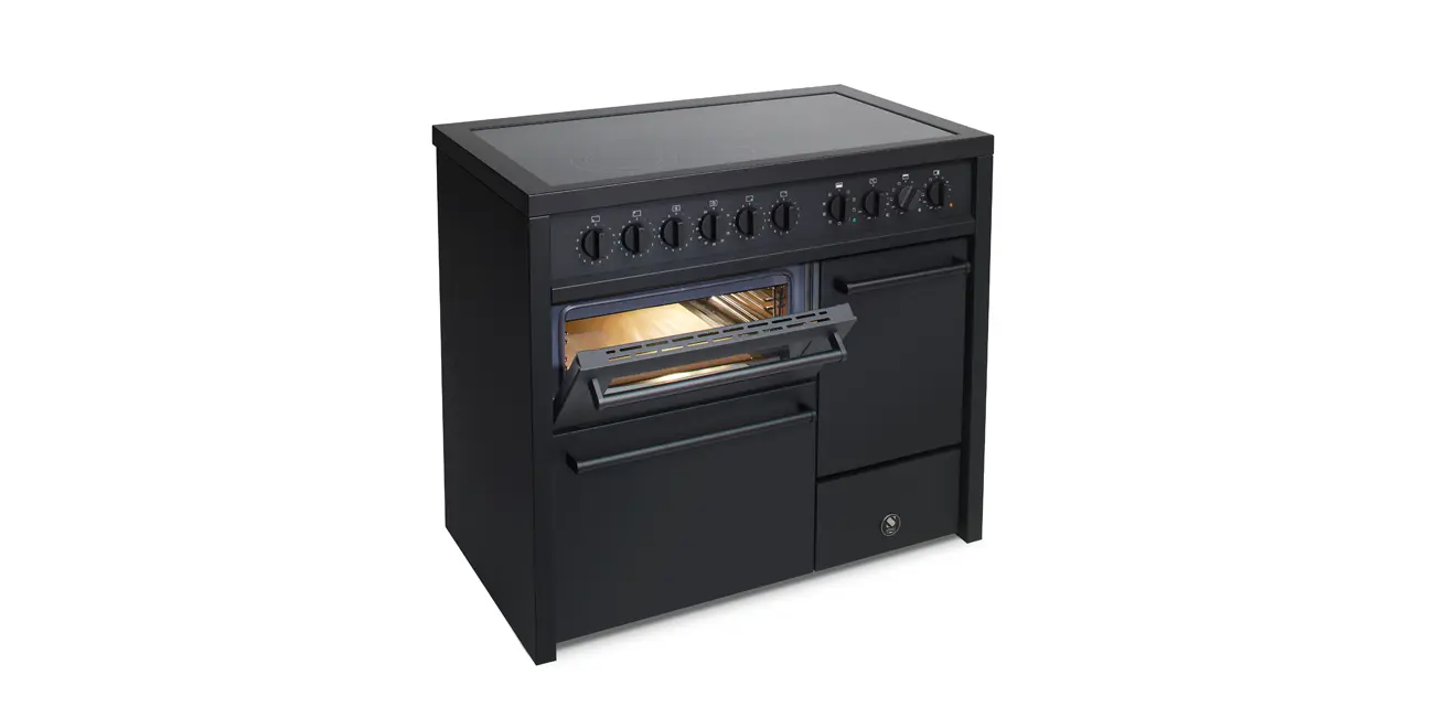 Der Steel Enfasi 100/2 ist ein hochfunktionaler, 100 cm breiter Standherd im reduzierten Edelstahl- oder Matt-Schwarz-Design. Er kombiniert zwei oder drei unabhängige Backöfen wahlweise mit einem Gas- oder Induktionskochfeld.