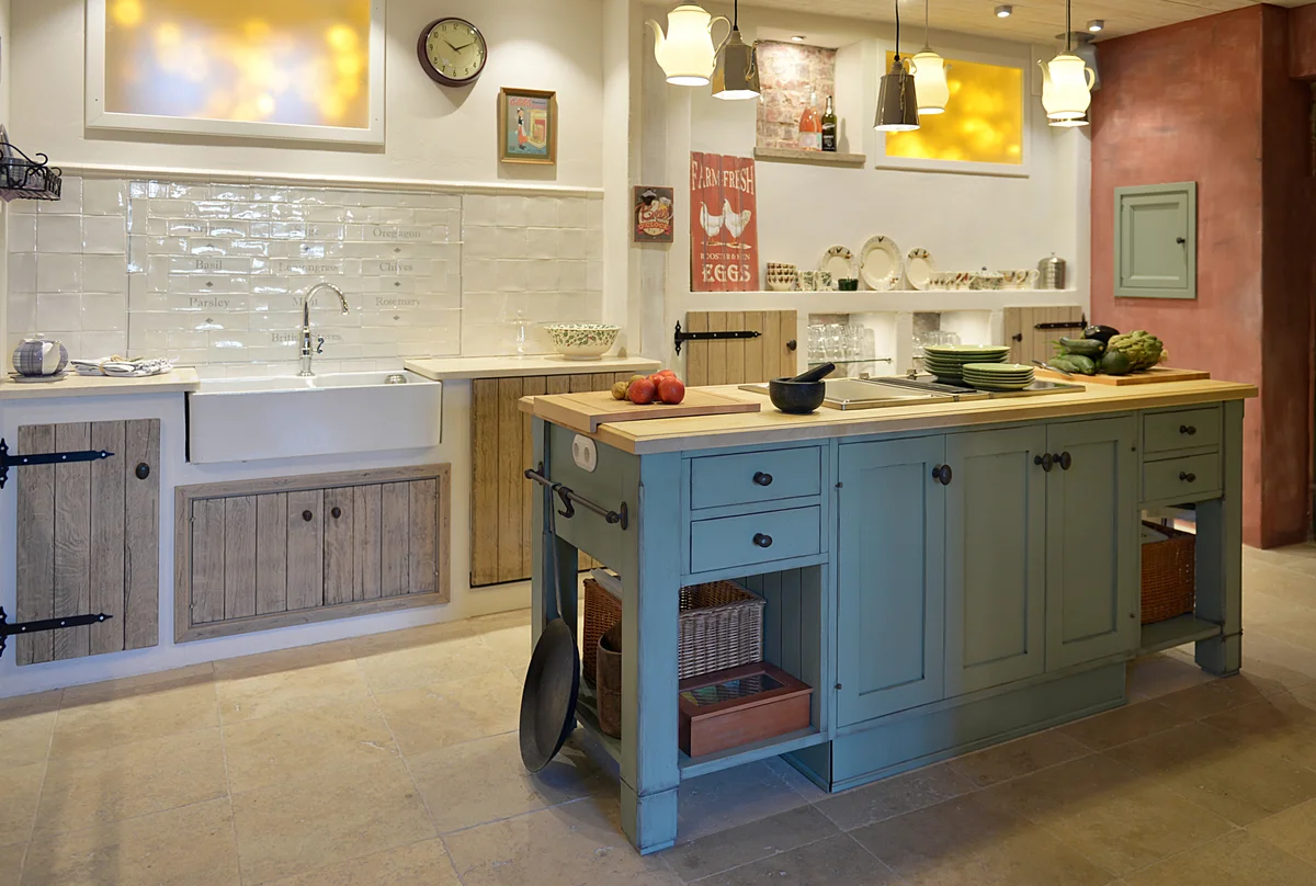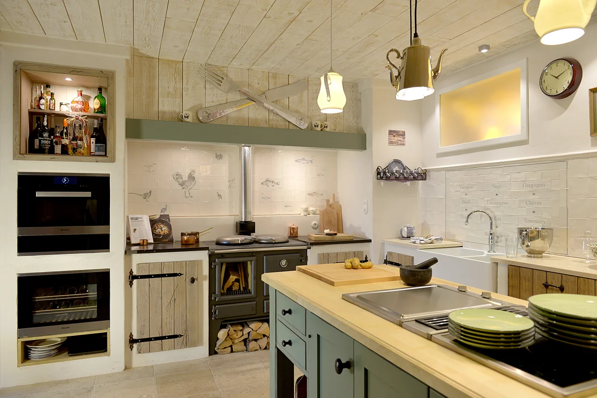Rustikale Massivholzküche mit Strukturelementen, verputzten Flächen und rustikaler Ausstrahlung – typisch englisches Farmhausflair mit echtem Materialgefühl und warmem Charme.